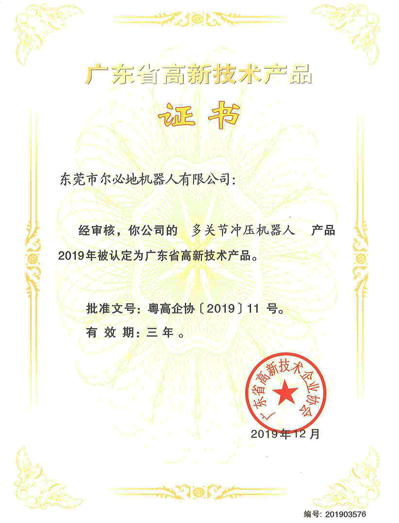 多關節(jié)沖壓機器人高新技術產(chǎn)品證書